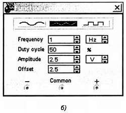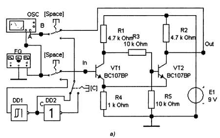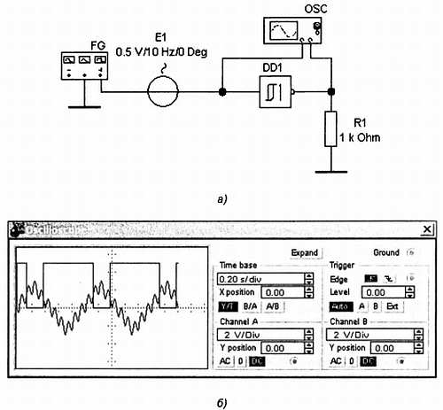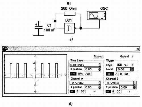 Рассмотрим в программе EWB работу классической схемы триггера Шмитта на двух транзисторах (VT1 и VT2) с эмиттерными связями (см. рис. 104, а).