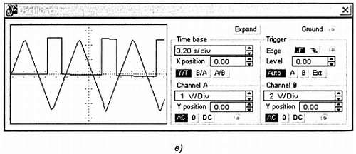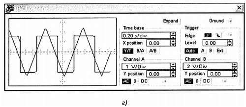 Как уже отмечалось, в ТШ наблюдается характерный гистерезис — отставание величины выходного напряжения от входного. Если частоту следования импульсов уменьшить в десять раз (для этого надо воспользоваться установочными кнопками в окошке Frequency функционального генератора), то можно визуально пронаблюдать, как по мере роста напряжения вычерчивается вся кривая, проходя фигуру против часовой стрелки. Такой своеобразный вид передаточной функции триггера обусловлен его переключением под действием входного напряжения, регулируемого двумя обратными связями: положительной ОС со второго каскада на первый за счет общего резистора R4 и отрицательной ОС по току через этот же резистор, когда открыт транзистор VT1. Если теперь переключить генератор на режим синусоидальных колебаний, а осциллоскоп на развертку сигналов во времени (Y/T), то синусоидальные колебания на входе превращаются в синфазные (по основной гармонике) прямоугольные колебания на выходе триггера (см. рис. 104, г), поскольку в данном случае реализован неинвертирующий триггер Шмитта.