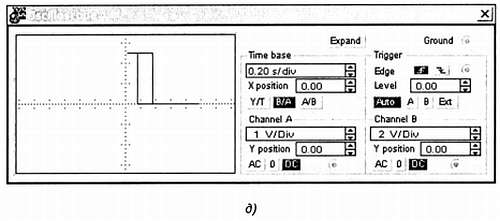 В комплекте базовых логических элементов программы EWB имеется инвертирующий триггер Шмитта (см. компонент DD1 на схеме рис. 104, а). Для снятия передаточной характеристики этого триггера надо перевести переключатель [Space] в нижнее, а ключ [С] — в левое положение. Установив режим развертки в положение В/А, а генератор на треугольную форму колебаний, получим характеристику, показанную на рис. 104, д. В ней обход петли гистерезиса наблюдается по часовой стрелке. Если подать теперь на вход ТШ DD1 синусоидальные колебания, на его выходе (в точке С) получатся противофазные (по основной гармонике) колебания прямоугольной формы (рис. 104, е). Эти колебания можно превратить в синфазные, снимая сигнал с инвертора DD2 (переведя ключ [С] в правое положение и проведя инверсию сигнала с помощью триггера DD2). В этом случае колебания будут аналогичны рис. 104, г.