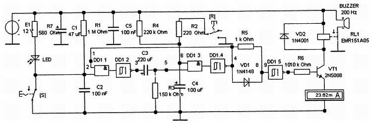 Здесь она выполнена средствами программы EWB и несколько отличается от оригинальной (входящей в комплект), но и назначение ее иное: это виртуальная модель, работу которой можно проверить на компьютере. В основе блока лежит микросхема CD 4093, содержащая триггеры Шмитта. На рис. 107 мы «разнесли» эту микросхему поэлементно, дополнив два первых триггера (DD1.2 и DD1.4) расширением входов по И (DD1.1 и DD1.3). Типы выходного транзистора VT1, электромагнитного реле — RL1 и зуммера — BUZZER взяты произвольно, но так, чтобы модель была работоспособной. Для подбора этих компонентов в схему дополнительно включен амперметр, регистрирующий выходной ток (в пренебрежении током базы). Остальные номиналы и нумерация выводов микросхемы соответствуют оригиналу. После вышеизложенного, не трудно видеть, что на элементах DD1.1-DD1.4 выполнен автогенератор, а ТШ DD1.5 является формирователем импульсов. Выходной каскад на VT1 представляет собой усилитель, нагрузкой которого служит электромагнитное реле RL1, к нормально разомкнутым контактам которого подключено устройство для звуковой сигнализации. После включения моделирования программа автоматически ведет расчет и выводит в онлайновом режиме результаты. Если замкнуть ключ [S] на землю, то у светоизлучающего диода (LED) «зачернятся» выходные стрелки (анимация), амперметр начнет показывать некоторый ток (который будет возрастать) и из штатного динамика ПК (если там таковой имеется) раздастся тональный сигнал тревоги.