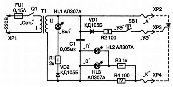 Прибор питается от сети переменного тока напряжением 220 В через сетевой трансформатор Т1. Переменное напряжение вторичной обмотки подается на зажим ХР2, предназначенный для подключения к аноду проверяемого прибора, и через резистор R4 — на зажим ХР4 для подключения к катоду. Зажим ХР3 подключается к управляющему электроду.