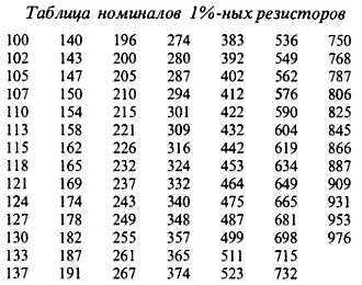 Стандартные значения сопротивлений лежат в диапазоне от 10,0 Ом до 301 кОм, и смежные значения отличаются одно от другого примерно на 2 %, некоторые изготовители, правда, предлагают подобные резисторы с сопротивлением от 4,99 Ом до 2,00 МОм. Стандартные значения для каждой декады приведены в представленной ниже таблице.