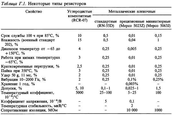 Резисторы с допуском 1 % часто используют в тех случаях, когда требуется очень высокая точность и стабильность; к группе прецизионных резисторов можно подключить небольшой регулируемый потенциометр. Рассчитывая на худший случай, следует иметь в виду, что для резисторов с допуском 1 % гарантируется величина сопротивления в пределах допуска только в определенных условиях. При изменении температуры, высокой влажности и при работе с предельными значениями мощности величина сопротивления может легко выйти за пределы допуска. Дрейф сопротивления со временем может достигать 0,5 %, особенно если резисторы работают с предельными значениями мощности. В схемах, от которых требуется особая точность и стабильность (порядка 0,1 %), следует использовать прецизионные проволочные резисторы или специальные пленочные резисторы, обеспечивающие такую стабильность. То же самое можно сказать и о композитных резисторах. Не стоит тешить себя мыслями, что фабричные спецификации на резисторы слишком консервативны, они отражают реальное положение вещей.