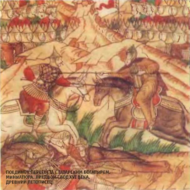 Насколько мне известно, этот сюжет «Сказания» никто из исследователей не подвергал сомнению, называя «традиционным», хотя на протяжении долгой военной истории Руси наши летописи не знают ни одного случая поединка перед битвой, кроме тех, что мы находим в «Повести временных лет», – кожемяки с печенегом и Мстислава с Редедей, одинаково принадлежащих литературе.