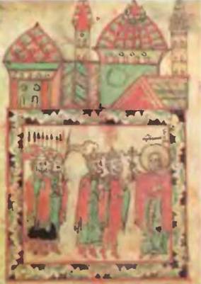 «И ПРИИДЕ КНЯЗЬ ВЕЛИКИЙ ДМИТРИЙ ИВАНОВИЧ 3 БРАТОМ СО КНЯЗЕМ ВЛАДИМИРОМ АНДРЕЕВИЧЕМ В ТОЙ ДЕНЬ КО ОТЦУ СВОЕМУ ПРЕОСВЯЩЕННОМУ КИПРИЯНУ МИТРОПОЛИТУ». СТОЯЩИЙ СПРАВА МИТРОПОЛИТ КИПРИАН БЛАГОСЛОВЛЯЕТ КНЯЗЕЙ ДМИТРИЯ И ВЛАДИМИРА И ИХ СВИТУ. КНЯЗЬЯ В КОРОНАХ ПРОСТИРАЮТ РУКИ К КИПРИАНУ. ЛИЦЕВАЯ РУКОПИСЬXVII ВЕКА ИЗ СОБРАНИЯ ГОСУДАРСТВЕННОГО ИСТ0РИЧЕСКГО МУЗЕЯ
