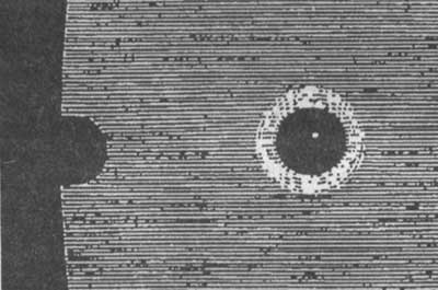 Случай проверить дифракционную гипотезу представился 7 мая 2003 г., когда Меркурий вновь проходил по диску Солнца. В 9 часов утра я навел на него свой телескоп «Алькор». Весьма скромный диаметр объектива (6,5 см) как раз подходил для наблюдений эффектов дифракции. При 133-кратном увеличении диск Меркурия бросался в глаза как черный кружок. Он был заметно темнее, чем расположенная рядом крупная группа солнечных пятен. Вокруг планеты хорошо видно светлое дифракционное кольцо шириною 5—10 % от диаметра Меркурия. Но никакого намека на легендарное центральное пятно света!