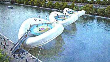 МОСТ ДЛЯ СПОРТСМЕНОВ решили построить в Париже. Сегодня реку Сену пересекают 38 мостов, вот архитекторы с мостовиками и решили 39-й сделать особенным. На фото видно, что по существу он будет представлять собой гигантский батут. Три опоры, около 30 м в диаметре каждая, смогут удерживать широкие натянутые сетки.