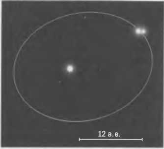 Рис. 6.10. Схема тройной звезды HD 188753. Рядом с более крупным одиночным компонентом, возможно, движется планета — гигант. Если ее существование подтвердится, это станет проблемой для теории формирования планет.