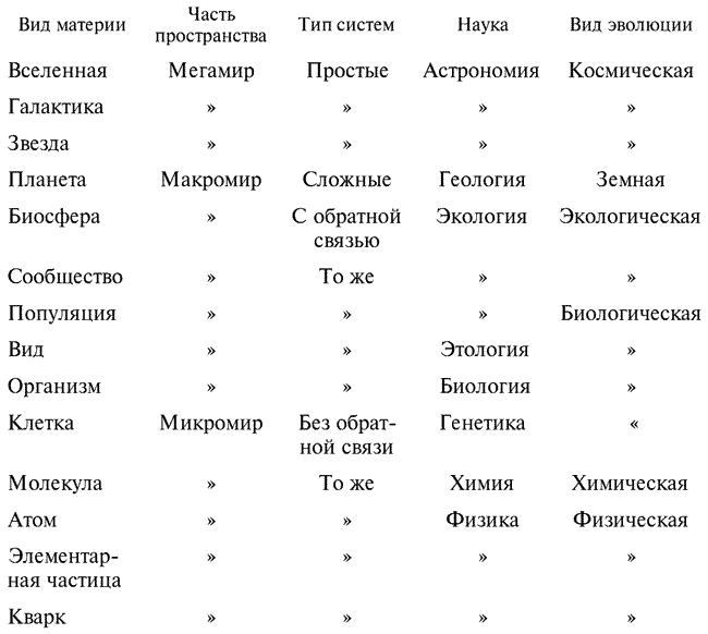 Можно построить и более подробную картину, выделив такие уровни организации, как ядро атома, ядро клетки, макромолекула, кристалл, планета, человек, ноосфера и т. д.