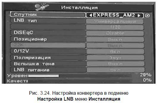 Далее в подменю Настройка LNB настраивается конвертер (рис. 3.24). Устанавливаются следующие параметры: