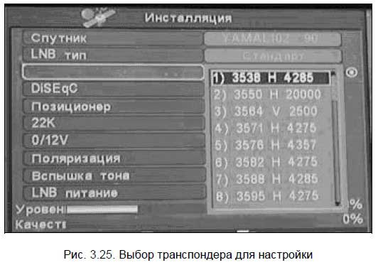 Затем выбирается номер транспондера (рис. 3.25). В открывшемся меню в поле Номер ТП выбираем, например, 17/109, что соответствует частоте 11034 МГц, тип сканирования каналов Открытые — выбираем Нет, что позволит сканировать все каналы. Впрочем, если поступить наоборот и в этом поле поставить галочку, тогда система просканирует и оставит в памяти ресивера только открытые (не кодированные) каналы. Если в опции Поиск канала установить ТВ+радио, в памяти останутся и радиоканалы тоже; если это не нужно, выбираем только ТВ. В опции Режим поиска выбираем вариант Сканирование по предварительной установке.