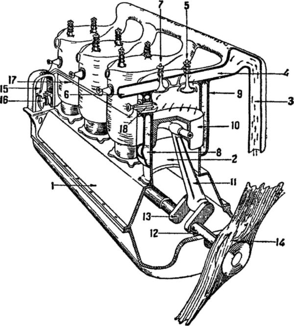 Рис. 10. Схема авиамотора. Для наглядности показаны только главные части и один цилиндр разрезан. 1 Картер. 2 Цилиндр. 3 Впускная труба. 4 Путь горючей смеси. 5 Впускной клапан. 6 Выпускная труба. 7 Выпускной клапан. 8 Вода для охлаждения цилиндра. 9 Водяная рубашка. 10 Поршень. 11 Шатун. 12 Коленчатый вал. 13 Колено вала. 14 Пропеллер. 15 Магнето. 16 Якорь магнето. 17 Электрические провода от магнето к свечам. 18 Свеча.