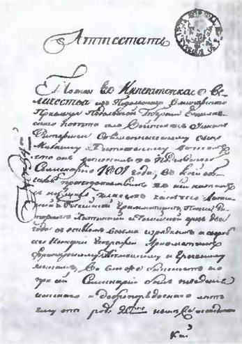 Аттестат М. А. Достоевского об обучении в Подольской семинарии. 1809. Центральный исторический архив Москвы