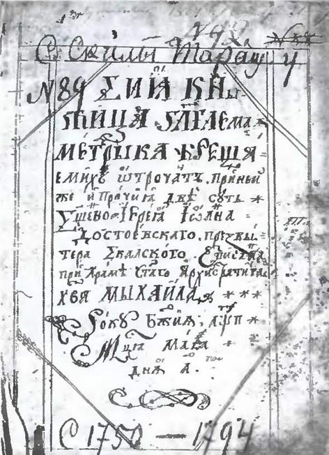 Обложка метрической книги села Скала, надписанная Иоанном Достоевским - старшим братом деда писателя. Центральный государственный исторический архив Украины. Киев. Публикуется впервые