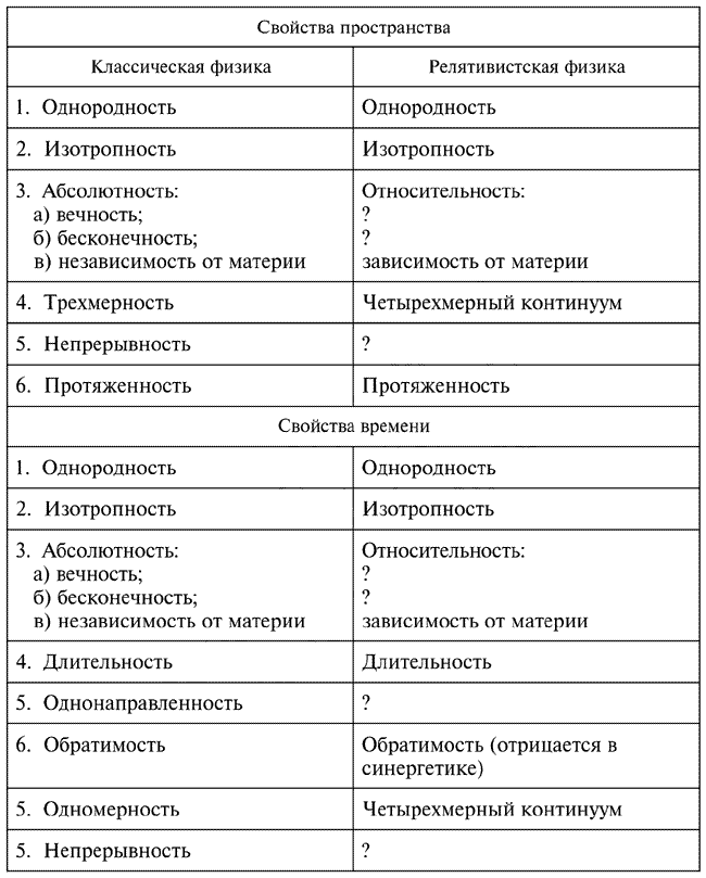 Пространство и время традиционно рассматривались в философии и науке как основные формы существования материи, ответственные за расположение отдельных элементов материи друг относительно друга и за закономерную координацию сменяющих друг друга явлений. Характеристиками пространства считались однородность — одинаковость свойств во всех точках и изотропность — независимость свойств от направления. Время также считалось однородным, т. е. любой процесс в принципе повторим через некоторый промежуток времени. С этими свойствами связана симметрия мира, которая имеет большое значение для его познания. Пространство рассматривалось как трехмерное (длина, ширина, высота), а время — как одномерное и идущее в одном направлении: от прошлого к будущему. Время необратимо, но во всех физических законах от перемены знака времени на противоположный ничего не меняется и, стало быть, физически будущее неотличимо от прошедшего.