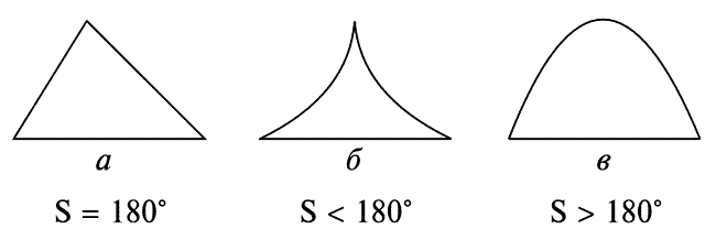 Рис. 4. Углы треугольника в евклидовой (а) и неевклидовой (б, в) геометрии, где S — сумма углов треугольника.