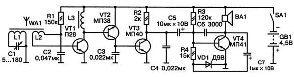 Сигнал, принятый магнитной антенной WA1, с помощью катушки связи L2 поступает на базу транзистора VT1, работающего в каскаде усиления радиосигнала. С коллекторной нагрузки — дроссель L3 — сигнал подается на базу транзистора VT2, выполняющего функции детектора. Нагрузкой детектора является эмиттерный переход транзистора VT3 — первого каскада усилителя звуковой частоты. Выходной каскад усилителя собран на транзисторе VT4 по схеме с общим эмиттером и непосредственным включением динамической головки ВА1 в цепь коллектора. Оконечный каскад работает в режиме с плавающей рабочей точкой: благодаря наличию выпрямителя С7, VD1, R4 с увеличением амплитуды сигнала растет напряжение отрицательного смещения. Благодаря этому ток покоя оконечного каскада оказывается в несколько раз меньше, чем при фиксированном смещении.
