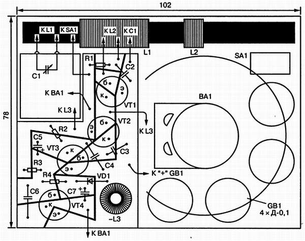 Дроссель L3 наматывается на ферритовом кольце К10х6х3 и содержит 250 витков. Динамическая головка — 0,25ГДШ-2-50 с сопротивлением звуковой катушки 50 Ом (ее прежнее название — 0.1ГД-17). Батарея питания собирается из четырех дисковых аккумуляторов Д-0,1, соединенных последовательно.