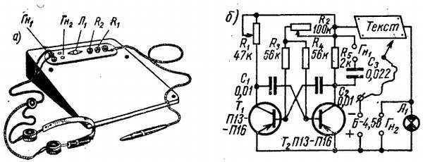 Работа прибора. Ученик приобретает навык письма путем обвода прописи металлическим пером. При правильном обведении текста, написанного на матрице, сигнальная цепь разорвана и ученик не слышит сигнала, а лампочка выключена. Если же рука сбивается — металлическое перо, соединенное с источником питания звукового генератора, включает сигнальную цепь. Ученик слышит в головных телефонах сигнал звуковой частоты, тональность и громкость которого можно изменять потенциометрами R1 и R2. Таким образом достигается контроль правильности обвода прописи.