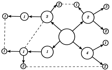 Использование такого метода дает возможность оперировать идеями, концентрированным выражением которых являются вписанные в кружки заголовки или заменяющие их отдельные наиболее выразительные слова, подобранные автором так, чтобы даже при беглом взгляде вызвать у него в памяти всю сумму необходимых сведений. Еще большая концентрация мысли достигается применением символов и пиктограмм (вопрос об их использовании рассмотрен выше в гл. 3). При этом автор одним взглядом охватывает во много раз больший материал, чем если бы он был выражен словами. Манипулирование идеями «в чистом виде», без попыток их словесного выражения позволяет сделать структуру будущего изложения максимально логичной и ясной. Случайные повторения смысловых единиц почти исключаются. Вместе с тем при необходимости рассмотрения одного и того же факта в разных разделах текста автор заранее предусматривает такую возможность с помощью «горизонтальных связей» (рис. 7):