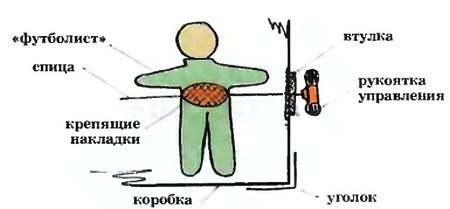 Прикреплять фигурки к спицам можно по-разному. Например, чуть-чуть расплющив спицу пассатижами. К получившемуся гнезду-лопаточке прикладываете фигурку и зажимаете между двумя кусочками фанеры — на клею или гвоздях. В качестве рукояток используйте колесики от игрушек или крышечки от лекарств. Отверстия под спицы высверливаете или просто распиливаете в нужных местах до половины бруска, куда затем вкладываете спицы вместе с закрепленными на них «футболистами». Распил после этого заклеиваете полоской картона.