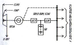 Обычно в состав энергоагрегата, кроме одного или нескольких ППД и электрогенераторов, входит еще блок возбуждения, управления и защиты электрогенератора (БВУЗ), который, в свою очередь, состоит из блоков возбуждения и управления (БВУ), защитной автоматики (БЗА), системы управления (БСУ). На схеме показан вариант электроагрегата с асинхронным электрогенератором, поэтому для его работы блок возбуждения БВ снабжен еще и конденсаторами. Распределительное устройство связывает электроагрегат с потребителями энергии.