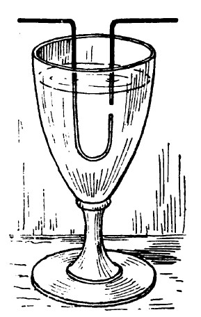 Погрузив в рюмку с водой оба конца, замкните ток элемента, приводящего катушку в действие, и сближайте концы проволок, пока не получится «подводная» искра.