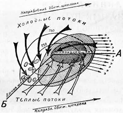 Можно провести даже границы между этими двумя частями циклона и двумя основными потоками воздуха в нем, — справа это будет так называемая "направляющая линия", по которой обычно следует циклон с запада на восток. Она носит название теплого фронта. Левая линия шквалов носит название холодного фронта. Посмотрим, что будет происходить на этих разделах. Теплые потоки воздуха на линии "направляющей", встретившись с поперек им идущими холодными потоками, вынуждены будут уступить их преграде, потому что теплый воздух легче холодного. Накопляясь здесь, потоки теплого воздуха начнут вследствие этого вытесняться вверх и натекать поверх холодных потоков. Это и есть то, что обычно называют восходящими токами. Восходящие токи, продолжая свой путь поверх холодных, образуют большую облачность, так как вместе с теплом несут и большое количество паров. Поэтому здесь возникают осадки и грозовые явления, которыми так характерен циклон в передней своей части. На линии же холодного фронта мы увидим обратное явление. Там холодные массы воздуха наталкиваются на поперечное им теплое течение и, будучи тяжелее теплых, начнут опускаться книзу и внедряться под теплое течение. Поэтому, с одной стороны, здесь температура станет падать, с другой же стороны — поднятые холодным воздухом кверху теплые потоки дадут кратковременную, прерывающуюся облачность и осадки. Здесь будет происходить борьба между теплом и холодом, дождем и прояснением. Это — тот тип погоды, который обычно наблюдается после прошедшего обложного циклонического дождя и который характеризуется названием "шквалов". Что же касается северной части циклона и главным образом северо-западной, то там будет сравнительно ясное небо при пониженной температуре.