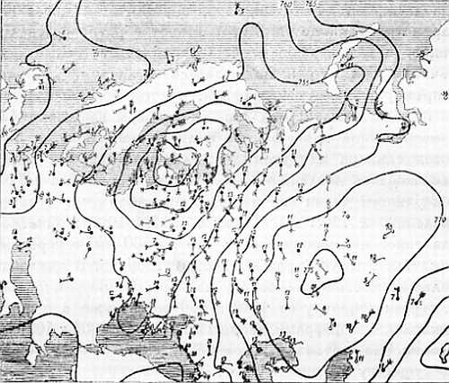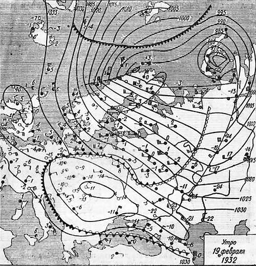 Практическое следствие теоретических рассуждений было так очевидно, что Леверье удалось вскоре же при правительственной поддержке наладить первую государственную службу погоды — систему предсказания погоды по телеграфу из Франции. С 1857 г. к этой системе стали примыкать и другие государства. Так возникла синоптическая метеорология — собирание одновременно производимых метеорологических наблюдений в разных местах и обработка их в едином центре, откуда на основании изданной карты погоды стало возможным делать первые предсказания ожидаемой погоды. В дальнейшем делу, начатому Леверье, сильно помогли другие страны. С этих пор и начало развиваться учение о строении и движении циклонов и антициклонов и о барическом рельефе. У нас синоптические карты стали выходить с 1872 г. Так как в большинстве случаев циклоны движутся с запада, то Россия оказалась в особенно счастливом положении: наблюдения, производимые в Западной Европе, сообщенные нам по телеграфу, уже дают богатый материал для предсказания погоды у нас. Циклон, возникший где-либо в Исландии, прежде чем попасть к нам, должен пройти над Англией, Францией, Германией; наиболее краткий его путь в наш Союз будет лежать все же через Скандинавию. Сеть метеорологических станций на нашей территорий уже будет иметь значение для востока Союза и Сибири. Но это не значит, что для нас собственная сеть станций может иметь только второстепенное значение. Дальнейшая разработка синоптической метеорологии показала, что для полного уяснения законов, управляющих движением циклонов и антициклонов, недостаточно единичного их изучения, а необходимо исследование барического рельефа всего земного шара или по крайней мере северного полушария.