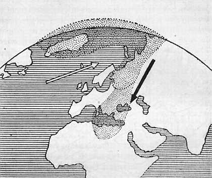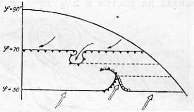 Формы "языка" и "капли" не случайны. Острый язык или клин теплого воздуха, имея в общем стремление с юга на север, прокладывает себе путь с большим трудом среди "нейтральных" частиц "переходного" воздуха, обладающих меньшей скоростью вращения, и своей формой как бы следует суживающимся к полюсам меридианам. Наоборот, "капля" холодного воздуха, устремляясь с севера на юг, легко прокладывает себе путь, внедряясь под теплый воздух. Растекаясь на восток и запад, вследствие ускоренного вращения частиц тропосферы, она следует форме расходящихся меридианов.