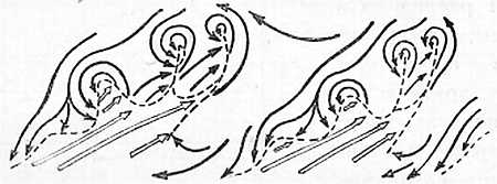 Циклон никогда почти не бывает одиночным, а наблюдается целая семья их, следующих друг за другом — отца, сына и внука (терминология Бьеркнеса), причем отец идет несколько впереди, сын же и внук отстают; в тылу каждого из них наблюдается прорыв арктического воздуха к югу (рис. 89).