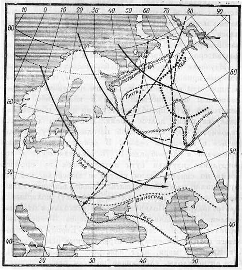 Изучение распределения барических образований, которые приносят нам все типы погоды, показало, что антициклоны в путях передвижения по Европе обладают известным постоянством: если в каком-либо сезоне некоторый путь преобладает, то по нему обычно они движутся очень долгое время. Этим-то и создается склонность для однотипной погоды подолгу удерживаться в известном сезоне. В секторе долгосрочных прогнозов в Ленинграде Б. П. Мультановский и его сотрудники изучили пути антициклонов за прежнее время по синоптическим картам и выяснили, что эти пути можно классифицировать. Преобладающими оказались пути (или "оси", как их называют) полярные и ультраполярные. Полярные веером расходятся от Гренландии и Исландии и, спускаясь через Феноскандию в Белое море, пересекают Восточную Европу с уклоном к юго-востоку и востоку. Ультраполярные оси, спускаясь от Карского моря, идут навстречу первым (рис. 91).