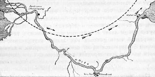 На месте Ленинграда в то время, по словам поэта, были лишь "ель, сосна да мох седой"; свидетелем грозного явления природы мог быть только "старый рыбарь бородатый". Если южная часть воображаемого нами циклона приблизительно совпадет с изгибом течения реки Невы, то, очевидно, сбегающие по ней ветры западных румбов будут на месте нынешнего Ленинграда — в дельте Невы — западного, западо-юго-западного или западо-северо-западного направления, при которых обычно и бывает нагон морской воды, производящий наводнение в дельте Невы. В то же время у Орешка и деревни Шереметьевки, где Нева истекает из Ладожского озера почти с севера на юг, ветры юго-западного или юго-юго-западного направления будут угонять речную воду, преодолевая течение. Вследствие этого здесь, в истоках, образуется обратное явление, чем в дельте — отлив в озеро, часть же воды, уносимая течением, постепенно будет истекать к порогам. Явление будет продолжаться, очевидно, до тех пор, пока длится наводнение в дельте Невы — часа четыре, иногда и больше, по мере того как циклон пройдет эту местность и последует смена ветров.