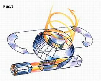 В нем образован кольцевой канал, к которому в момент старта с помощью заслонки присоединяется реактивный двигатель. И весь поток его газов направляется в корпус вихревого аппарата. Там он закручивается и превращается в вихрь, который, подобно смерчу, через кольцевое отверстие устремляется вверх.