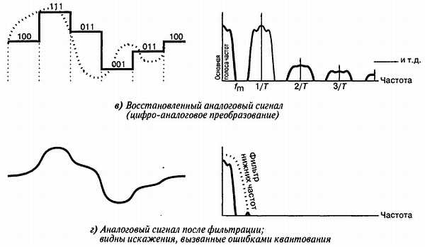Для восстановления исходного узкополосного сигнала из импульсной последовательности можно воспользоваться фильтром нижних частот, как показано на Рис. 14.3, г. Реальные фильтры будут пропускать определенные гармоники, хотя и ослабляя их. При более внимательном рассмотрении спектра сигнала на Рис. 14.3, г можно заметить остаток нижней боковой полосы первой гармоники, попавшей в полосу пропускания фильтра. Однако наибольшие искажения в восстановленном аналоговом сигнале возникли из-за ошибок квантования, вызванных грубой 3-битной дискретизацией. Подобная система будет иметь отношение S/N на уровне 20 дБ.