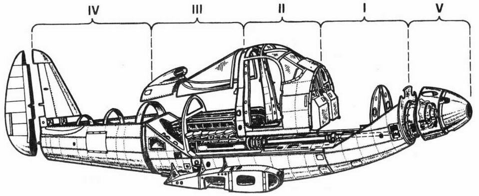 Фюзеляж самолета "Аэрокобра": I — отсек вооружения, II — кабина пилота, III — моторный отсек, IV — хвостовая часть, V — редуктор и кок винта.