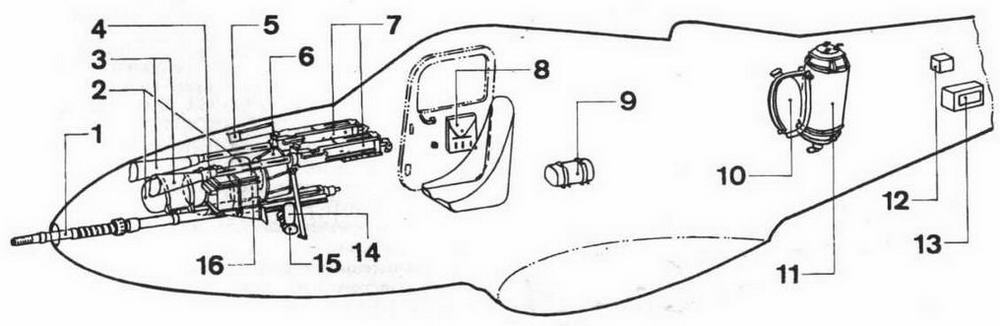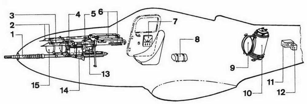 Вооружение и оборудование самолёта "Аэрокобра"I: 1 — 20-мм пушка, 2 — удлинительные трубы пулемётов, 3 — комплект инструментов для планера, 4 — маслобак редуктора, 5 — барабан пушки, 6 — 12.7-мм пулемёты, 7 — карман для карт, 8 — инструменты для мотора, 9 — бак охлаждающей жидкости, 10 — основной маслобак, 11 — связная радиостанция, 12 — аптечка, 13 — гликолевый бачок, 14 — аккумулятор, 15 — осевой кислородный баллон