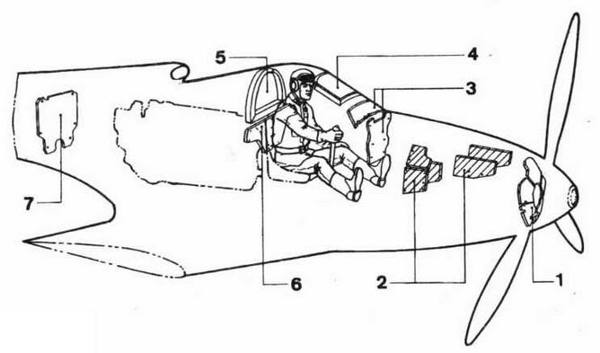 Бронирование самолётов "Аэрокобра"I, P-39D-1 и D-2: 1 — бронезащита редуктора, 2 — бронезащита кислородных баллонов высокого давления (только на "Аэрокобре"1, причем у самолётов, выпущенных с одним баллоном — только три левых плиты), 3 — две плиты передней бронезащиты кабины, 4 — лобовое бронестекло, 5 — заднее бронестекло в окантовке, 6 — бронеспинка (из двух плит), 7 — бронезащита маслорадиатора и мотора. Заштрихованные плиты у D-1 и D-2 отсутствовали