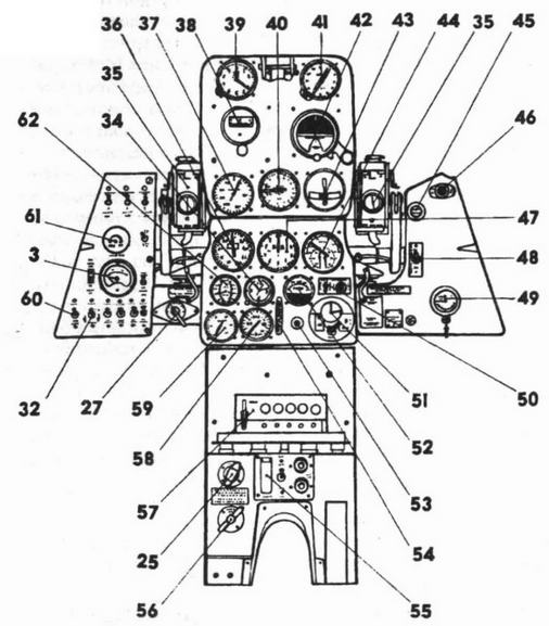 1 — переключатель управления щитками, 2 — переключатель управления шасси, 3 — амперметр, 4 — рукоятки перезарядки крыльевых пулемётов, 5 — планшет для карточки коррекции высотомера, 6 — бронестекло, 7 — зеркало заднего обзора (только на Р-400), 8 — прицел ST-1A, 9 — кольцевая рамка прицела (только на Р-400), 10 — манометр масла редуктора винта Ашкрофт 6711-91, 11 — термометр охлаждающей жидкости Ашкрофт 6642-56, 12 — планшет для карточки коррекции компаса, 13 — выключатель кодовых огней, 14 — шприц антиобледенителя, 15 — переключатель трубки Пито, 16 — переключатель питания указателя поворота, 17 — приборы кислородной системы, 18 — лампа подсветки приборов, 19 — педали управления рулем поворота и тормоза на земле, 20 — манометр бензина Ашкрофт 6750-84, 21 — панель радиооборудования, 22 — рукоятка ручной уборки шасси, 23 — выключатели радиостанции, 24 — рукоятка перезарядки пушки, 25 — помпа подкачки топлива, 26 — ручка управления, 27 — выключатель магнето и аккумулятора, 28 — ручка управления двигателем, 29 — ручка положения щитков и колёс шасси, 31 — реостат строевых огней, 32 — переключатель управления воздушным винтом, 33 — избирательный переключатель оружия, 34 — часы Кольсман 505К-01, 35 — затыльник 12.7-мм пулемёта, 36 — мановакуумметр Ашкрофт 6742-90, 37 — указатель скорости Кольсман 640К-01, 38 — гирополукомпас Сперри 643715, 39 — высотомер Кольсман 642К-05, 40 — вариометр Кольсман 643К- 04, 41 — компас, 42 — авиагоризонт Сперри 643710, 43 — указатель поворота Пионер А-5, 44 — двухстрелочный индикатор (температура и давление масла), 45 — кнопка впрыска гликоля, 46 — выключатель освещения кабины, 47 — тахометр Вестон-70, 48 — выключатель обогрева, 49 — регулятор подачи кислорода, 50 — переключатель и лампочка аварийного остатка топлива, 51 — радиочасы, 53 — сигнальная лампочка шасси, 54 — рукоятка стояночного тормоза, 55 — приёмник, 56 — сброс подвесного бака (или бомбы), 57 — панель управления радиооборудованием, 58 — манометр редукторного масла, 59 — вакуумметр Ашкрофт 6702-66, 60 — выключатель обогрева кабины, 61 — реостат прицела, 62 — манометр бензина ЕА-108