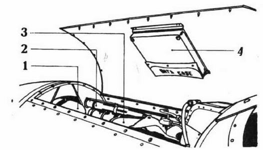 Вид на отсек вооружения P-39D-1 и D-2 при поднятой верхней панели: 1 — осевой кислородный баллон, 2 — барабан пушки, 3 — правый пулемёт, 4 — футляр документации.