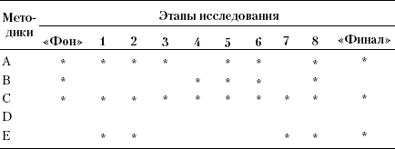 Если неразумное расширение выборки можно считать малым грехом, то метание от одной методики к другой – грех тяжкий. Представим себе так называемое лонгитюдное исследование, идея которого заключается в длительном (многомесячном или даже многолетнем) отслеживании динамики каких-либо физиологических, психофизиологических или иных показателей в одной и той же группе испытуемых или экспериментальных животных. Поставив себе такую задачу, исследователь должен после относительно краткого периода «пристрелки» определить, насколько это возможно, окончательный перечень методик. Он должен отчетливо понимать, что любое изменение методик «отправит в корзину» все данные, полученные с помощью предыдущего варианта. Добавление новых методик также подорвет идею «лонги-тюда». Вариантом этой же ошибки является частичная замена объектов исследования в ходе самого исследования. Представим сказанное в виде схемы (крестиками показано наличие экспериментальных или клинических данных, полученных на данном этапе исследования с помощью данной методики) – табл. 1.