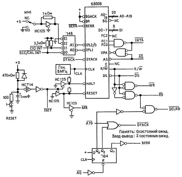RESET, прерывания, стробирующие сигналы. Для того чтобы выполнить начальную загрузку МП 68008, следует установить сигналы RESET' и HALT' (обе линии двунаправленные; надо использовать схему с открытым коллектором с принудительной установкой верхнего уровня). Мы применили простую схему автозагрузки, состоящую из RC-цепи, триггера Шмитта и кнопки. Обратите внимание на диод, служащий для быстрого разряда в случае коротких выбросов напряжения питания; более совершенная схема сброса при включении питания должна использовать цепь «микропроцессорного контроля» вроде МАХ692, дающую хорошо сформированный сигнал сброса. Линия, обозначенная нами MR', переводится в высокое состояние и при начальной загрузке, и (на время 128 тактов) при выполнении ЦП команды RESET; линия INIT' переводится в высокое состояние только при загрузке.