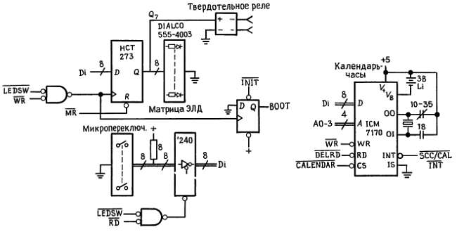 ЭЛД и микропереключатели. Это простейшие из портов. При выводе матрица ЭЛД управляется 8-разрядным регистром из D-триггеров, для которого тактовым является сигнал декодирования адреса LEDSW', объединенный с WR'. Обратите внимание на то, что стробирование выполняется срезом сигнала; это уменьшает проблемы синхронизации, связанные со временем упреждения. Мы использовали восьмиразрядный регистр `273 с бистабильными выходами (вместо более распространенной тристабильной микросхемы `574) ради входа RESET', который мы устанавливаем на время сброса процессора или начальной загрузки; в результате при запуске световая индикация отключается. Логические микросхемы семейства НСТ имеют хорошие характеристики по скорости насыщения и выходному току (8 мА при выходном напряжении 4,5 В), что дает возможность использовать заземленную матрицу ЭЛД (с микросхемами семейства LS начальный уровень ЭЛД должен быть +5 В); это очень удобно, так как диоды индицируют единицы, а не нули. Выбранная нами матрица ЭЛД имеет встроенные резисторы, органичивающие ток до 6 мА. Заметьте, что один из битов порта ЭЛД управляет твердотельным реле переменного тока. Эти реле легко запускаются логическими уровнями (гарантированное напряжение срабатывания 3 В, сопротивление нагрузки 1,5 кОм), и, кроме того, они переключаются при нулевом напряжении (см. разд. 9.08 и 9.10). Заметьте также, что строб-сигнал WRITE порта ЭЛД выполняет дополнительную функцию, сбрасывая триггер BOOT при своей первой установке; после сброса триггера порт ЭЛД можно использовать по своему усмотрению.