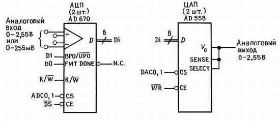 АЦП и ЦАПы. Эти порты устроены так же просто. Обе микросхемы конвертеров являются «комплексными», со встроенными таймерами и опорными источниками. АЦП AD670 удовлетворяет протоколу сигналов R/W' и DS', поскольку снабжен входами направления и разрешения кристалла. Запись (разрешение микросхемы осуществляется низким уровнем R/W') начинает преобразование, в то время как чтение позволяет получить результирующий байт. В цикле записи АЦП фиксирует два бита данных: BPO/UPO' управляет диапазоном входных сигналов (высокий уровень — биполярный сигнал, низкий — однополярный), a FMT определяет формат цифрового выхода (высокий — дополнение до двух, низкий — беззнаковое двоичное представление). Выходной сигнал DONE говорит об окончании преобразования; мы отказались от использования этого сигнала, потому что, как нам кажется, проще выполнить несколько команд NOP в течение времени преобразования (длительность которого не превышает 10 мкс), чем организовывать опрос флага.