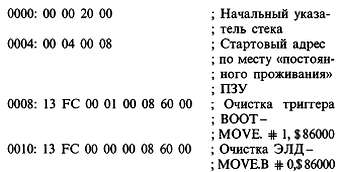 Первые 8 байт ПЗУ остроумно запрограммированы так, что осуществляется переход на продолжение программы начальной загрузки, но уже в старшем адресном пространстве, где (среди прочего) очищается порт ЭЛД (адрес $86000). Запись в порт ЭЛД имеет побочный эффект сброса триггера BOOT, в результате чего временный образ ПЗУ в начале адресного пространства замещается образом ОЗУ. Для пояснения сказанного, ниже приведено содержимое первых 24 байт ПЗУ, реализующих описанную процедуру: