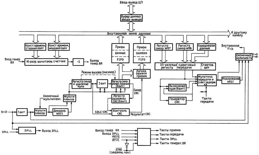 Примечание: BR — запрос шины; FIFO — «пеpвым вошел, первым вышел»; TxD — сигнал передачи; RxD — сигнал приема; NRZ1 — кодирование без возвращения к нулю с инверсией; CRC — контроль циклическим избыточным кодом; DPLL — фазовая автоподстройка частоты; SDLC — синхронное управление линиями передачи данных.