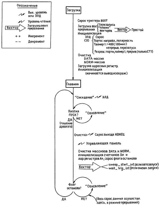 Главная программа: главный цикл. Завершив инициализацию, мы входим в бесконечный главный цикл main__loop. Фактически он состоит из двух циклов: цикла ожидания нажатия кнопки ПУСК и цикла непрерывного обновления памяти изображения, на фоне которого осуществляется сбор данных в режиме прерываний. Программа обработки прерываний, завершив последнюю развертку, устанавливает программный «флаг останова» stop__flag, который непрерывно проверяется вторым главным циклом. Обнаружив установленный флаг, главная программа возвращается в первый цикл ожидания нового пуска. Давайте сопоставим структурную схему и программные строки.
