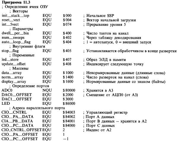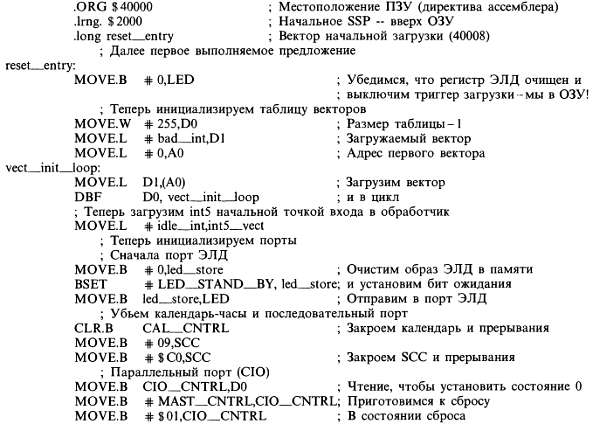 Наконец, началась программа! Первые 8 байт ПЗУ хранят важнейший стартовый вектор: указатель стека и входную точку программы. Входная точка находится в «истинном» ПЗУ (по адресу $40008), поэтому мы можем немедленно очистить бит BOOT, что приводит к замещению временного образа ПЗУ, используемого при начальной загрузке, оперативной памятью. Теперь мы можем загружать векторы прерываний в начало ОЗУ, в конкретные ячейки, определяемые архитектурой МП 68008 (вся область векторов приведена в табл. 11.5): $68 (INT2), $74 (INT5) и $7С (NMI = INT7). Мы использовали только INT5 (от 100 мкс — таймера в микросхеме параллельного порта); в этот вектор мы загружаем адрес нашего обработчика прерываний. В зависимости от конкретного состояния прибора (ожидание пуска или внешнего сигнала запуска, начало новой развертки, процесс развертки) обработчик прерываний должен выполнять различные функции; поэтому мы написали один грандиозный обработчик со многими точками входа, соответствующими его функциям. На данном этапе мы еще не готовы принимать данные, поэтому в вектор INT5 мы загружаем входную точку idle__int (прерывание простоя). Очень полезно загрузить на всякий случай все неиспользуемые векторы прерываний адресом bad__int (ложное прерывание) (вдруг произойдет деление на нуль, ложное прерывание и т. д.); мы загружаем в них адрес программы, которая зажигает ЭЛД определенным образом (далее будет видно, каким именно).