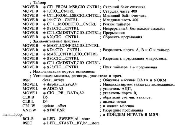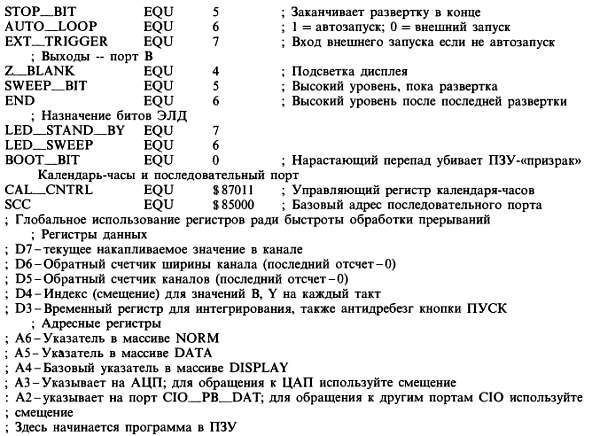 Из текста программы также видно, как мы будем использовать регистры МП 68008. При каждом прерывании мы извлекаем данные из АЦП, добавляем их к текущему содержимому канала и проверяем, не дошли ли мы до конца канала или развертки. Можно было хранить содержимое указателей и счетчиков в памяти (так и пришлось бы поступать при использовании менее совершенного процессора типа 8086), но зарезервировав достаточное число регистров для нужд обработчика прерываний, мы существенно повышаем эффективность режима прерываний. Поэтому мы выделили регистры данных для текущего содержимого канала (D7), обратного счетчика периодов дескретизации (внутри канала) (D6) и обратного счетчика каналов внутри развертки (D5), смещения в массиве DISPLAY (D4), а также регистр для временных данных (D3). Далее, мы зарезервировали адресные регистры для трех массивов (NORM, А6; DATA, А5; DISPLAY, А4) и для наиболее используемых портов (ADC0, A3; СIO [параллельный порт], А2). Главная программа берет на себя обязательство не использовать эти регистры при включенных прерываниях.