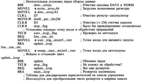 Далее программа очищает массивы DATA и NORM, инициализирует некоторые регистры (адресов и данных) и сбрасывает флаг останова. Последний шаг заключается в изменении содержимого вектора INT5 (который пока указывает на метку idle__int в обработчике прерываний) на адрес wait__trig или sweep__start в зависимости от того, какой режим установлен на управляющей панели: внешнего запуска или автозапуска.